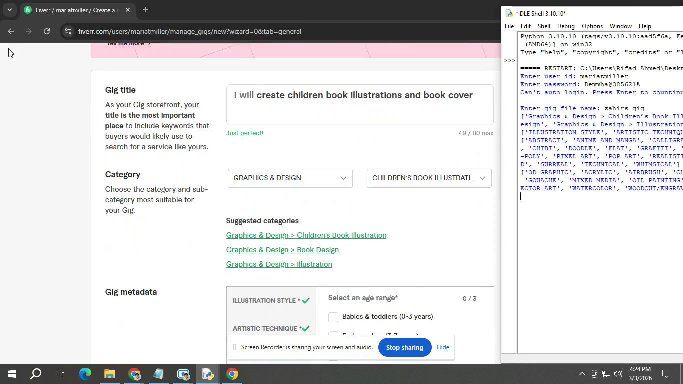 π Fiverr Auto Post Bot > Stop wasting hours creating gigs manually! βοΈ I built a Python Bot that does it for you. It takes the gig data I scraped earlier and automatically fills out all the forms on Fiverr - title, description, and tags! πβ‘οΈπ Just sit back and watch your services go live in seconds. π»β¨