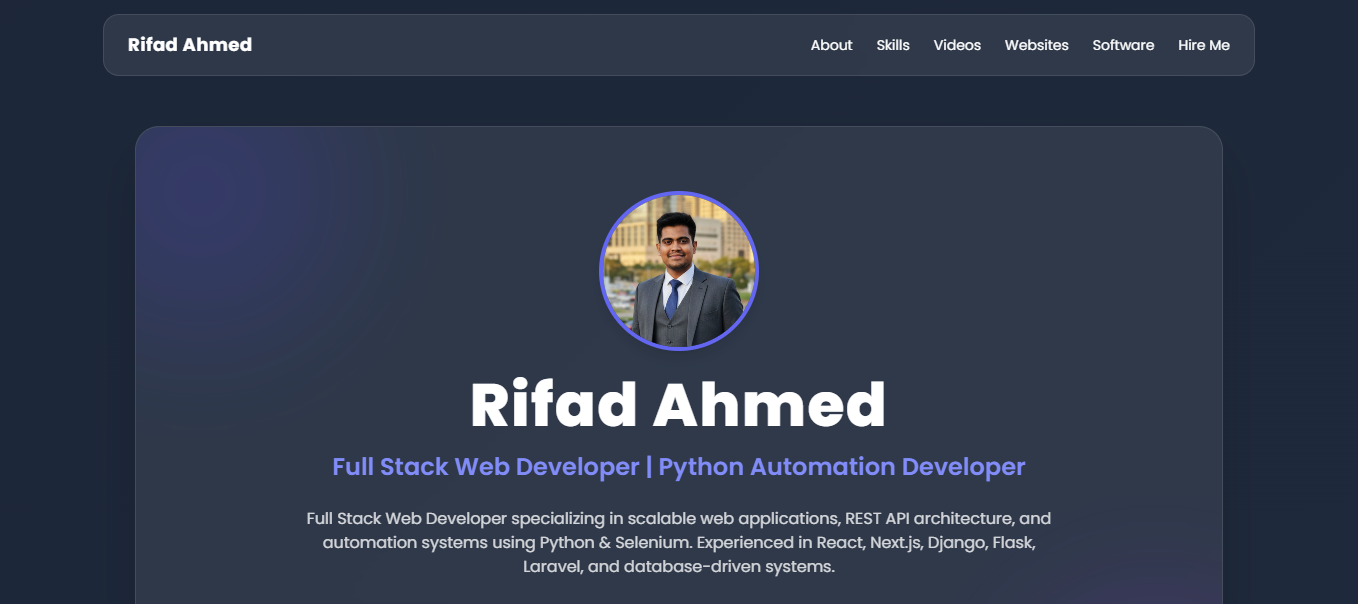 Full Stack Web Developer specializing in scalable web applications, REST API architecture, and automation systems using Python & Selenium. Experienced in React, Next.js, Django, Flask, Laravel, and database-driven systems.