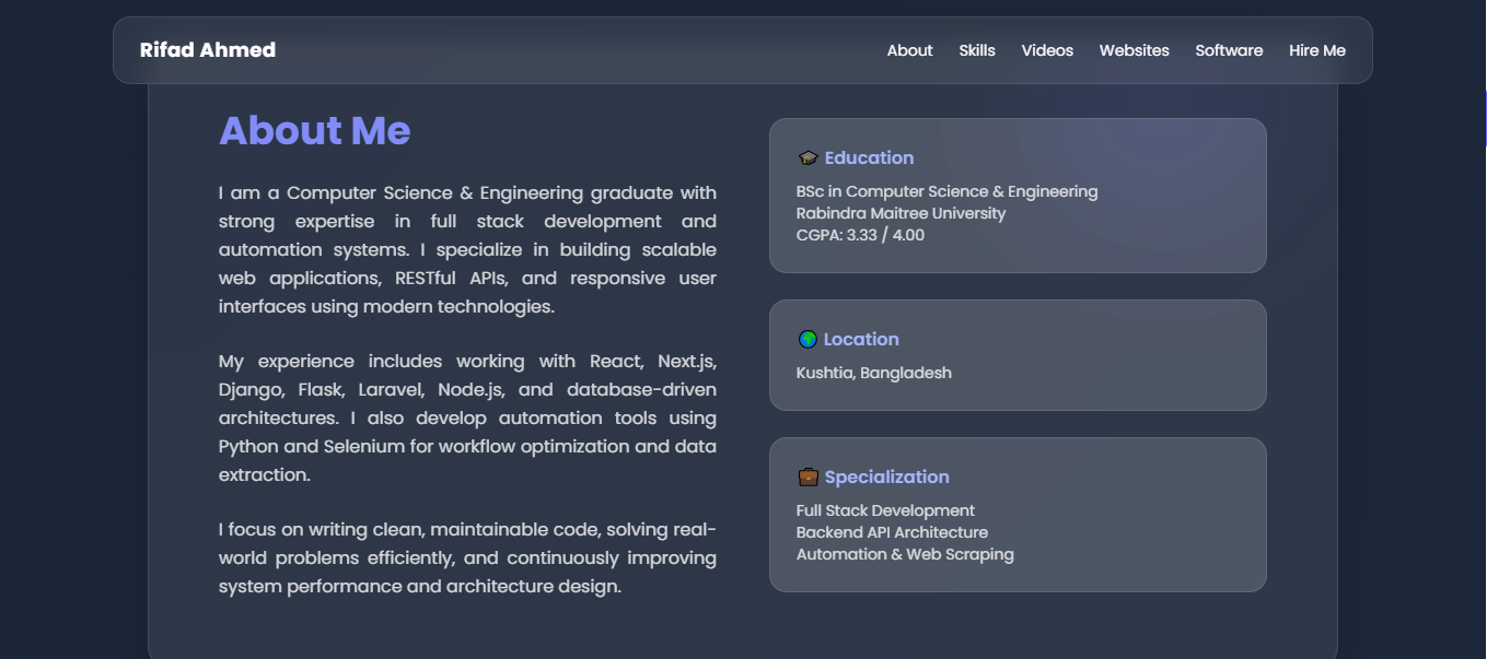 I am a Computer Science & Engineering graduate with strong expertise in full stack development and automation systems. I specialize in building scalable web applications, RESTful APIs, and responsive user interfaces using modern technologies.
