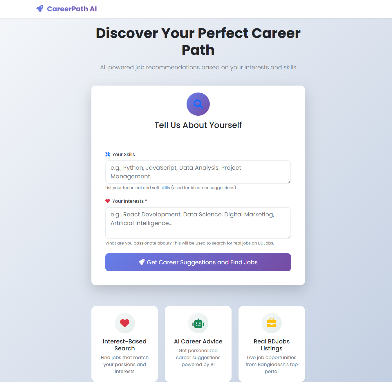 AI Career Explorer is a smart web platform that analyzes your skills and interests to suggest the best career paths for you. The system helps users discover suitable jobs, learn what skills they need, and provides a step-by-step roadmap to start learning and grow in that field. πΌ Suggests jobs based on skills & interests π§ Provides clear career learning roadmaps π Recommends where and what to learn β‘ Simple AI-powered career guidance for students and beginners