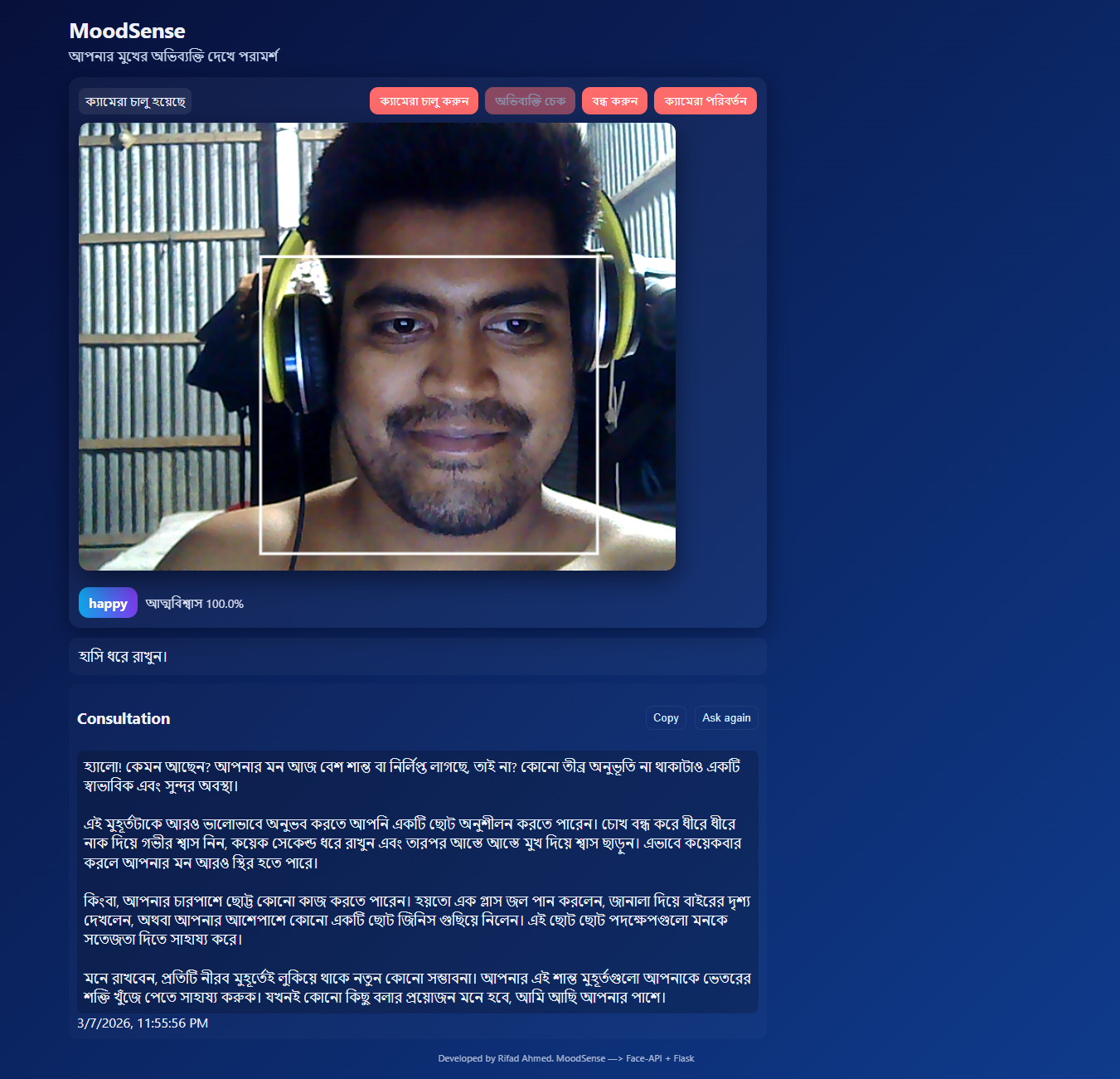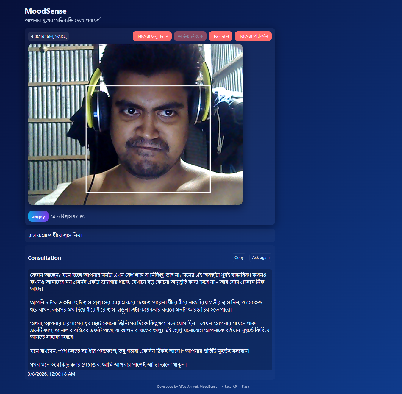 Built with Flask for the backend, MoodSense provides quick emotion insights and supportive recommendations to improve your mood. π Real-time face emotion detection π‘ Smart suggestions based on mood π· Camera-based AI analysis β‘ Fast and simple web experience